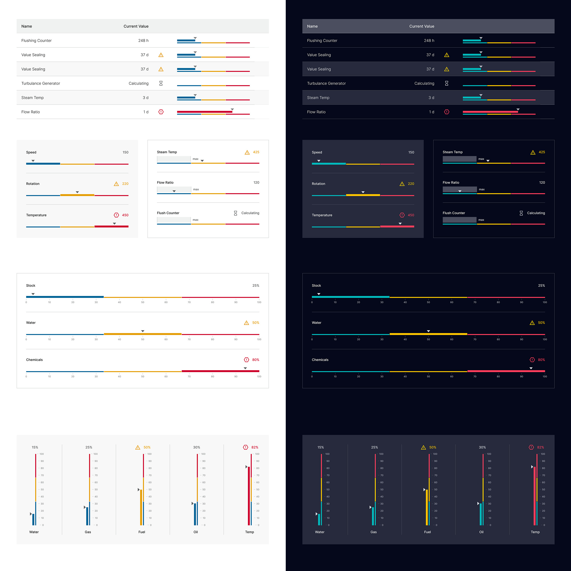 Entwickelt wurde ein zentrales, spartenübergreifendes Design System als verbindliche Grundlage für zahlreiche digitale Produkte. Das System umfasst Layout, Typografie, Farben, Icons und Effekte sowie eine umfassende Komponentenbibliothek. Diese beinhaltet sowohl grundlegende UI-Komponenten als auch komplexere funktionale Module wie unterschiedliche Navigationsstrukturen für Web, App und industrielle Applikationen. Das gesamte System wurde konsistent für Light Mode und Dark Mode konzipiert, um unterschiedlichen Nutzungskontexten gerecht zu werden.